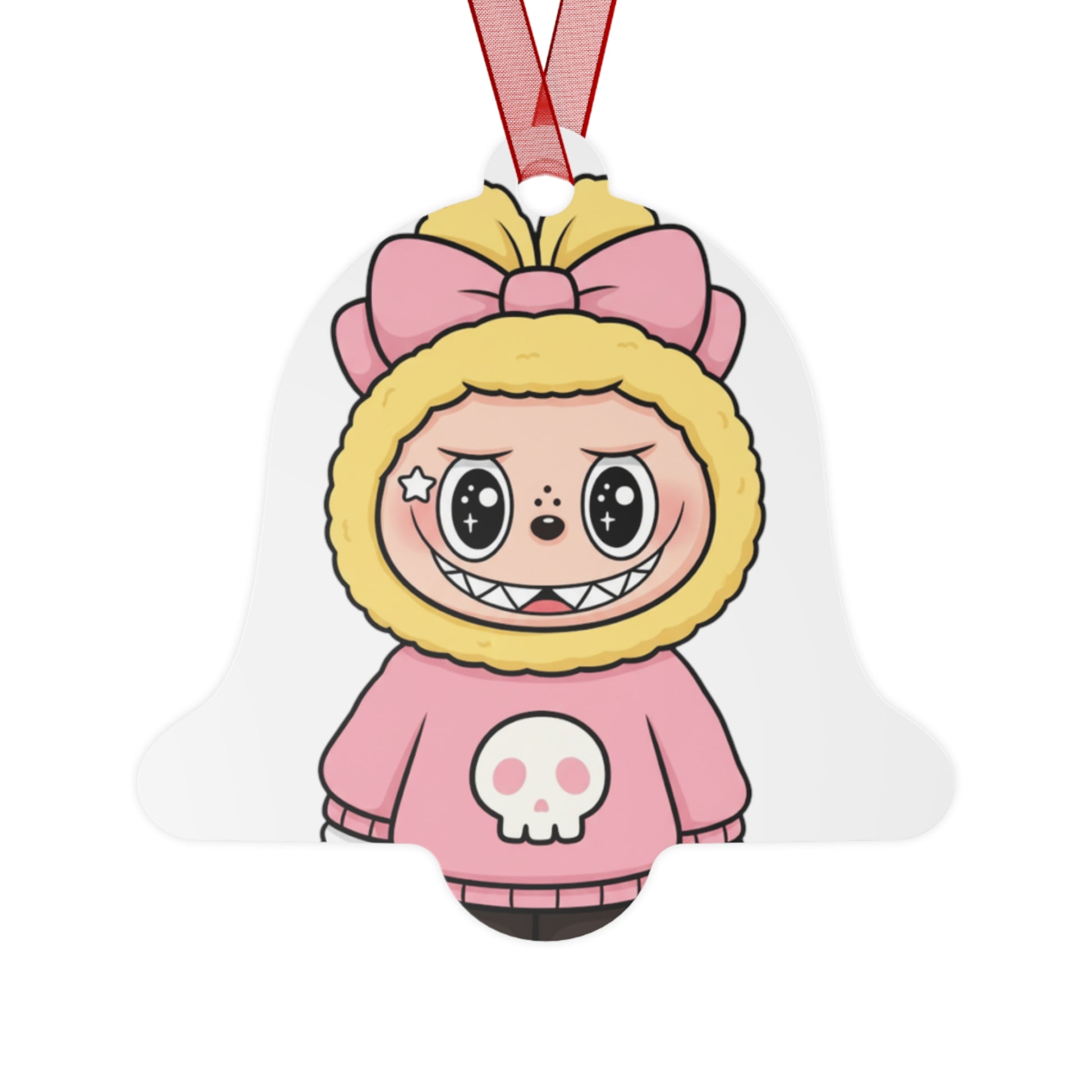 Hand-painted whimsy meets holiday sparkle. This glossy white metal ornament carries a charming, slightly spooky character—big shining eyes, a mischievous grin, and a soft pink outfit topped with a bow—printed on both sides so it pops from every angle. Lightweight and durable, the ornament arrives with a red ribbon threaded through a ready-made hole for easy hanging. Hang it on a tree limb, in a cozy window, or from a stocking hook to add playful personality to your seasonal decor. The vivid colors and chip-resistant aluminum hold up year after year, bringing a touch of quirky joy to festive mornings and late-night tree trimming sessions.