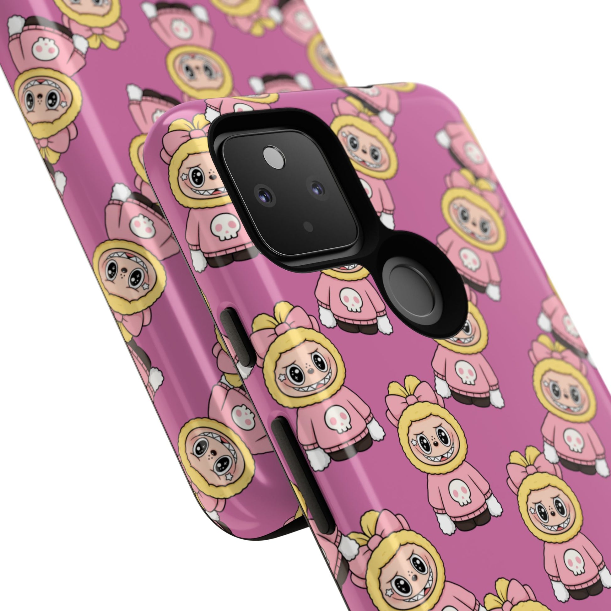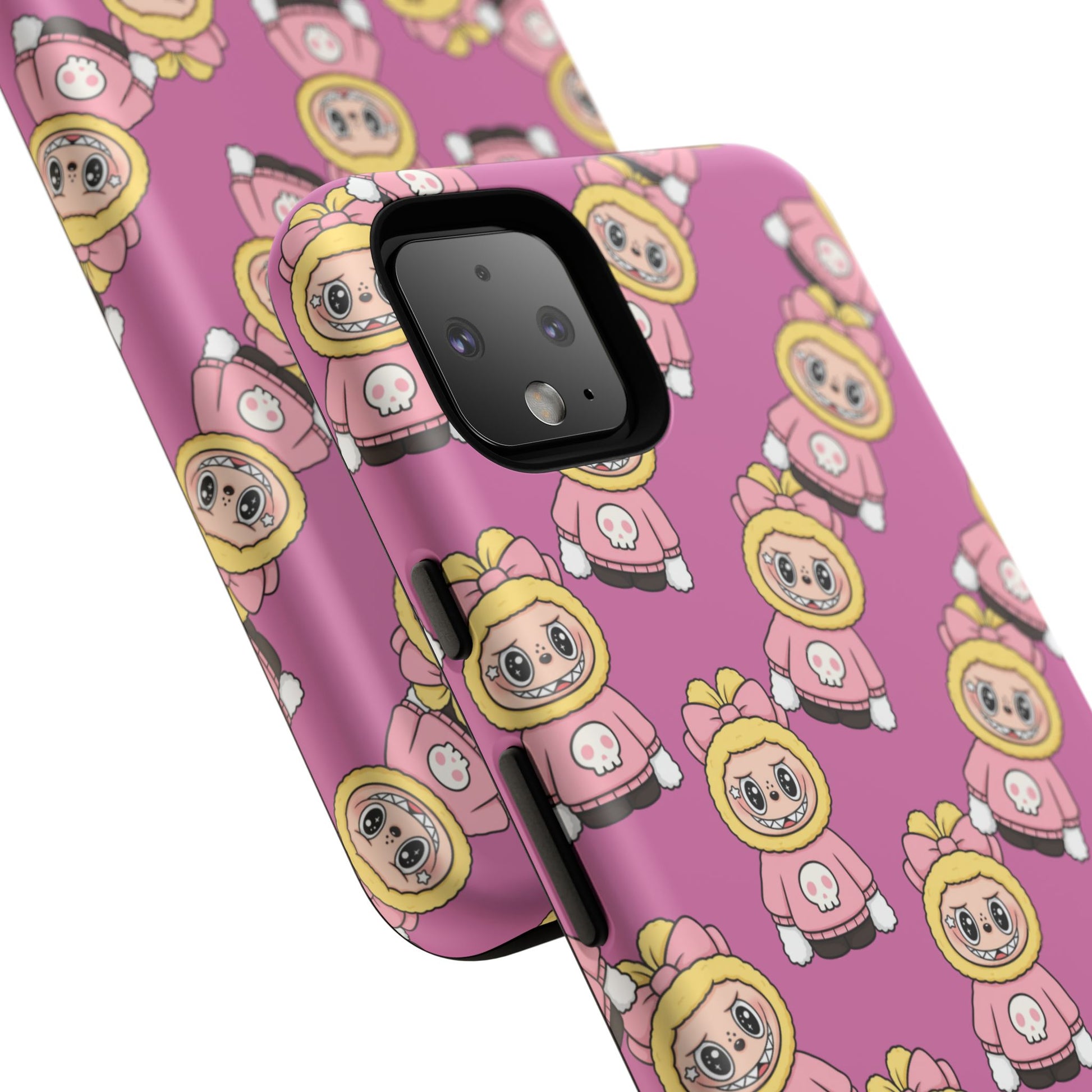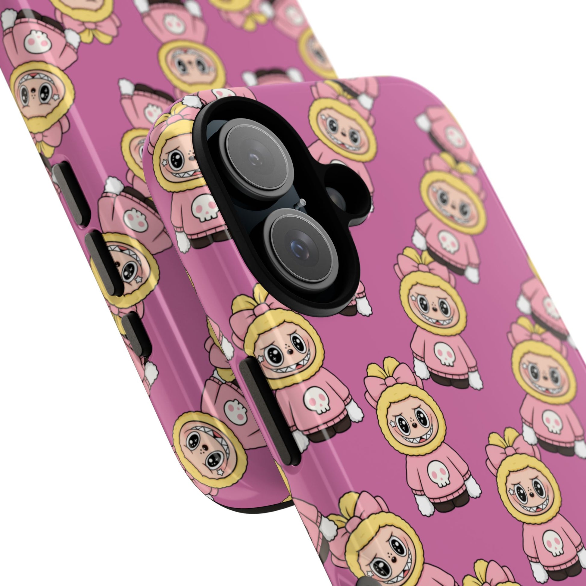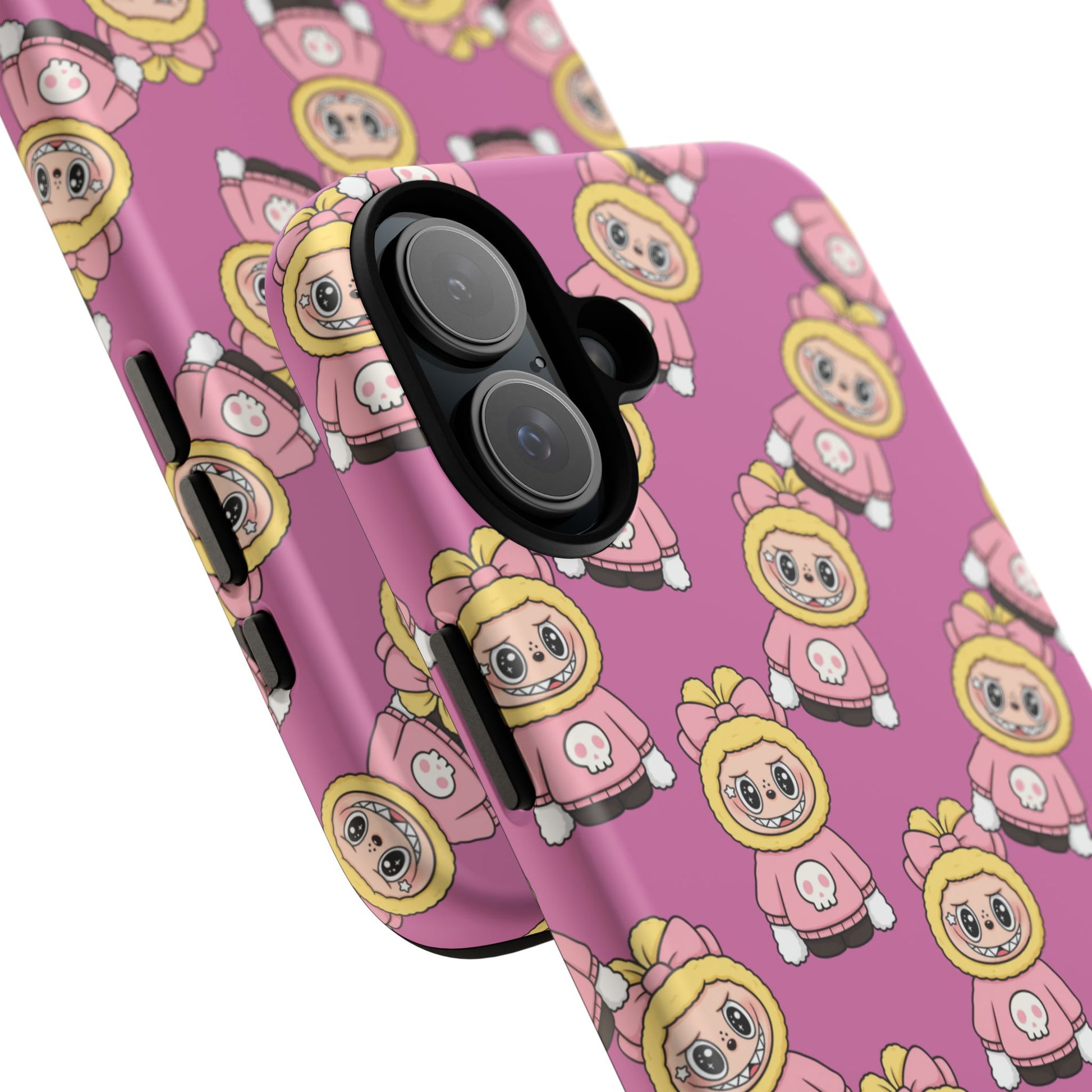 Wrap your phone in playful attitude with this tough protective case. The design blends candy-pink cuteness with an edge — a grinning character in a fluffy hood and skull sweater that reads both whimsical and spirited. The dual-layer shell and silicone liner absorb shocks while the full-wrap printing keeps the illustration vibrant from edge to edge. Lightweight and precise, it keeps ports clear and supports wireless charging so your routine stays smooth. Built for everyday knocks and bright personalities, this case keeps your device safe without hiding your style.