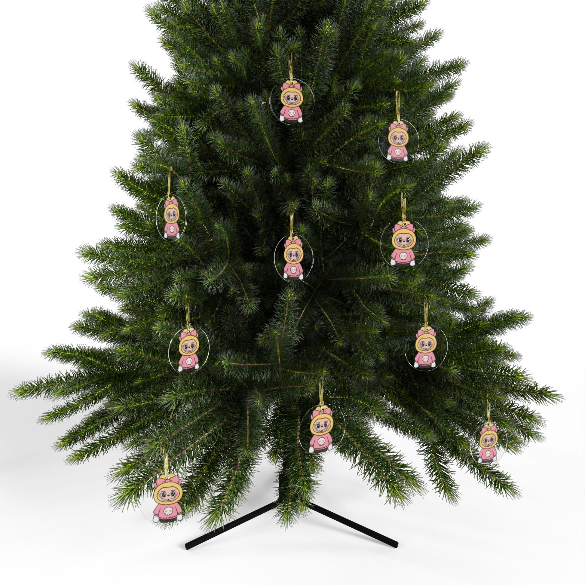 A clear acrylic ornament that brings playful charm to holidays and everyday décor. The glossy, full-color print showcases a cute character in a pink hooded outfit with a skull motif — bright, bold, and full of personality. The one-sided design sits on durable 100% acrylic for a lightweight but sturdy feel, and each piece arrives ready to hang on a tree or display with a shimmering gold ribbon. Available individually or in bundles, these ornaments add a pop of color and a touch of whimsy to cozy spaces, themed trees, or a collection of quirky keepsakes.